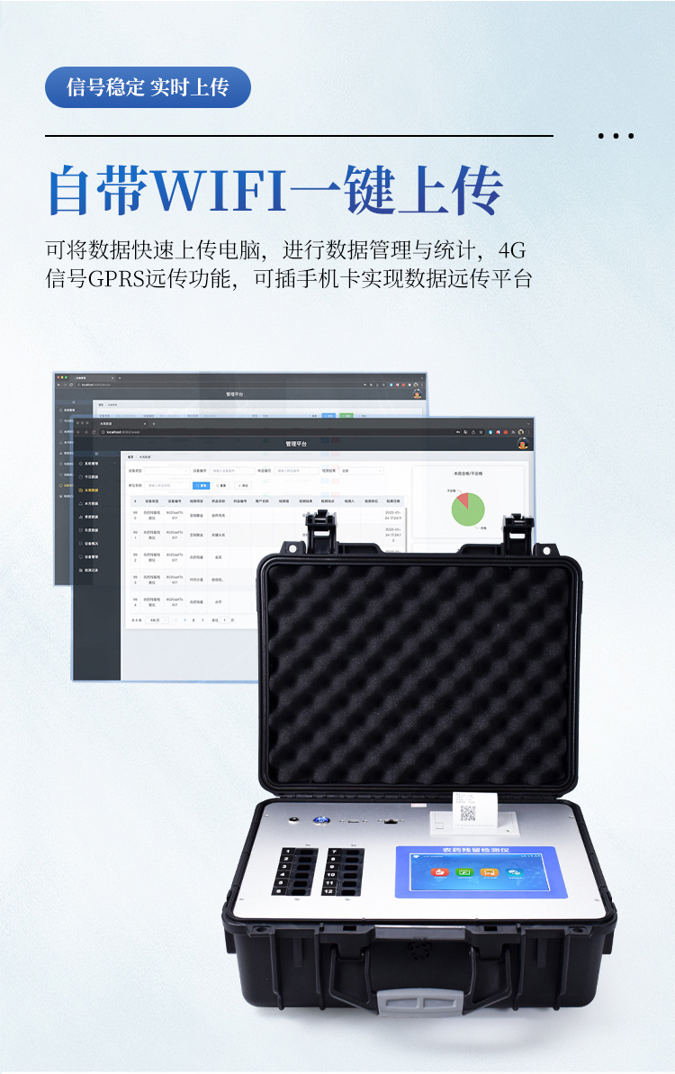 8、仪器带有监管平台,数据可局域网和互联网数据上传,检测结果直接传至食品安全监管平台。进行区域食品安全监管及大数据分析处理与数据统计,检测区域农产品安全长短期动态,达到食品安全问题预估、预警