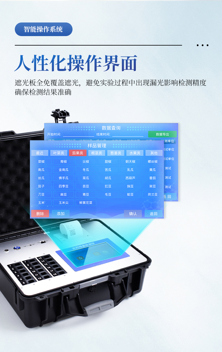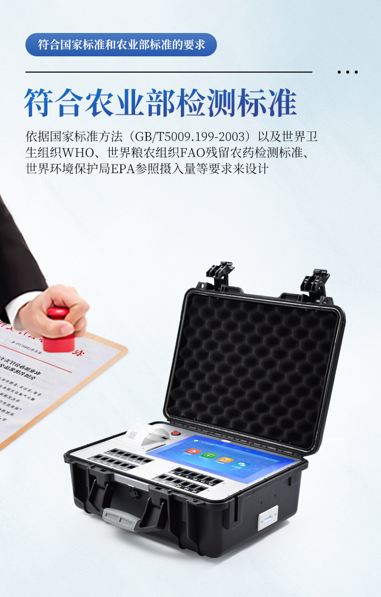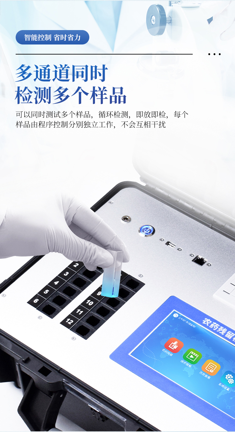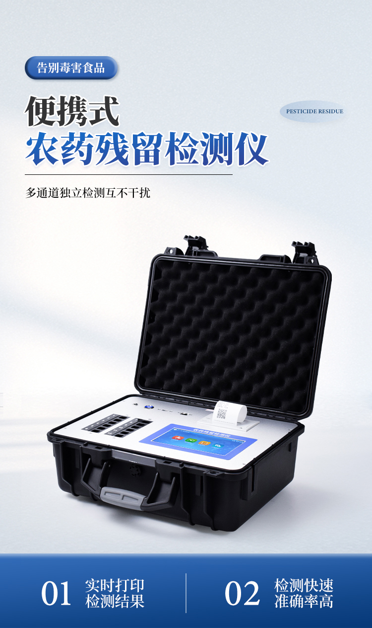 综合农药残留检测仪,除了遵循国标对有机磷和氨基甲酸酯类农药进行检测外,还可以针对具体农药进行分项准确检测,包含克百威、毒死蜱、异丙威、啶虫脒、氟虫腈、水胺硫磷、甲萘威、三唑磷、百草枯、甲霜灵、杀螟硫磷、百菌清-多菌灵2合1、氟虫腈-甲萘威2合1、甲基对硫磷、乙草胺、吡虫啉、多菌灵、阿维菌素、有机磷、甲草胺、涕灭威、百菌清、噻菌灵、三唑酮、氯吡脲、多效唑、氯噻啉、霜霉威、噻虫啉、辛硫磷、4-氯苯氧乙酸、2,4-二氯苯氧乙酸、2,4,5-三氯苯氧乙酸、6-苄基腺嘌呤、除草定、烯啶虫胺、噻虫嗪、异菌脲、氟苯脲、腐霉利、甲氰菊酯、高效氯氟氰菊酯、二甲戊灵、氟节甲基异柳磷、哒螨灵、噻虫胺、烯酰吗啉、嘧菌酯、氟乐灵、嘧霉胺、三唑酮/三唑醇、灭蝇胺、戊唑醇、甲拌磷、氯虫苯甲酰胺、二嗪磷、氧乐果、甲基吡啶磷、阿灭丁、双甲脒等众多杀虫剂化合物。