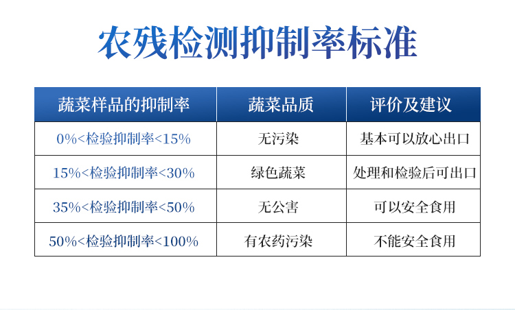 检测方法:有机磷和氨基甲酸酯类农药检测采用酶抑制率比色法,依据国家标准方法(GB/T5009.199-2003)。乙酰胆碱酯酶和丁酰胆碱酯酶试剂均可以使用,符合国家标准和农业部标准的要求;分项检测依据胶体金免疫层析法对众多的每种杀虫剂进行快速准确检测。
