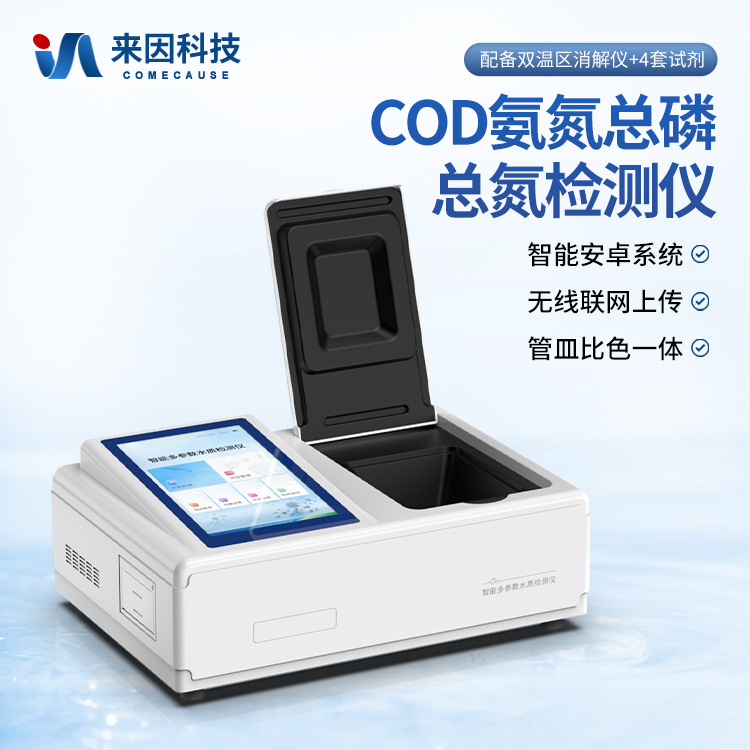 COD氨氮总磷总氮检测仪是参考《快速消解分光光度法(HJ/T 399-2007)》标准设计制造,主要检测水质中COD 、氨氮、总磷、总氮含量;本仪器兼具智能数据分析功能,图表、列表显示数据,分析一目了然;高清晰度彩色液晶触摸显示屏,Android智能操作系统,中文显示界面,中英文键盘,人性化操作,使用更简单。