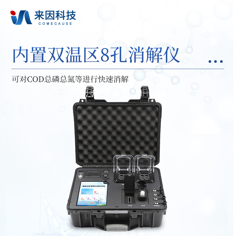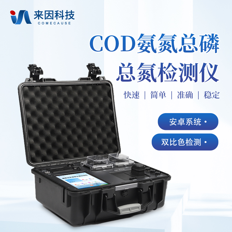 便携式COD氨氮总磷总氮检测仪采用高强度PVC工程塑料手提箱设计,消解检测一体式设计,其中消解模块具备双温区功能,检测部分同时具备360°旋转比色管检测和比色皿检测,安卓智能操作系统,8英寸高清液晶触摸屏,光纤检测技术,进口光源,内置大容量锂电池,便携多参数水质检测仪具有性能稳定、测量准确、测定范围广、功能强大、操作简单等特点。