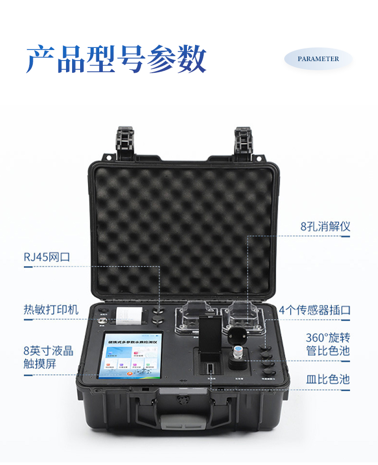 便携式多参数重金属检测仪采用高强度PVC工程塑料手提箱设计,消解检测一体式设计,其中消解模块具备双温区功能,检测部分同时具备360°旋转比色管检测和比色皿检测,安卓智能操作系统,8英寸高清液晶触摸屏,光纤检测技术,进口光源,内置大容量锂电池,便携多参数水质检测仪具有性能稳定、测量准确、测定范围广、功能强大、操作简单等特点。