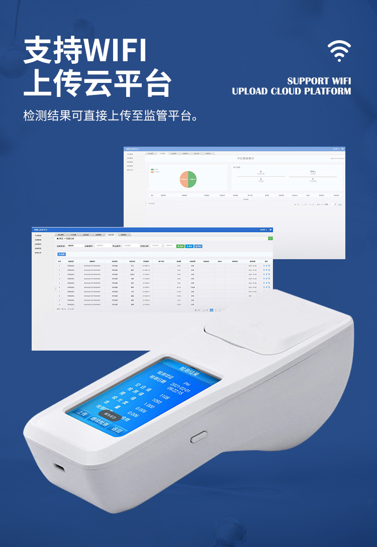配置监管平台,检测结果可直接无线传至平台,进行水质长短期分析,辅助管理。