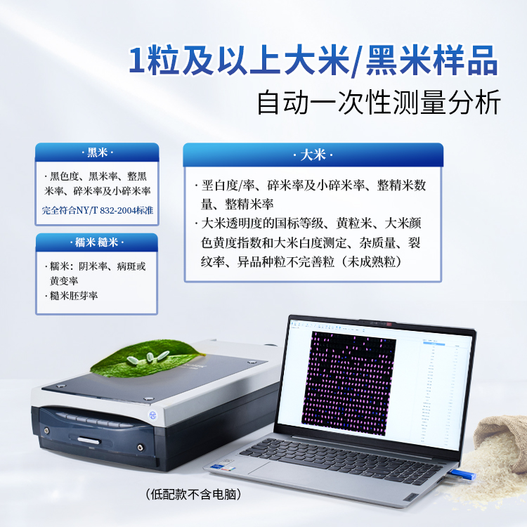 2、★可自动一次性测量分析1粒及以上大米样品的:垩白度/率、碎米率及小碎米率、整精米数量、整精米率、可直接检测大米透明度的国标等级、黄粒米、大米颜色黄度指数和大米白度测定、杂质量、异品种粒、不完善粒(未成熟粒)、裂纹率。还可测量糯米的阴米率、病斑或黄变率。糙米胚芽率。