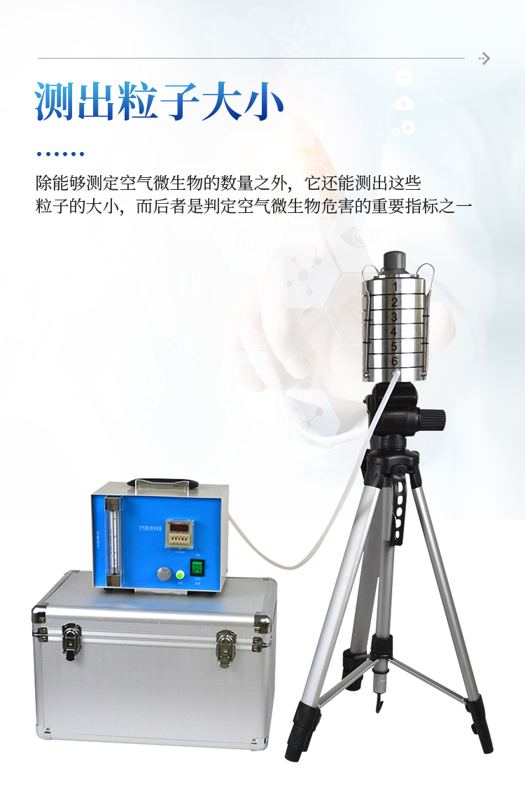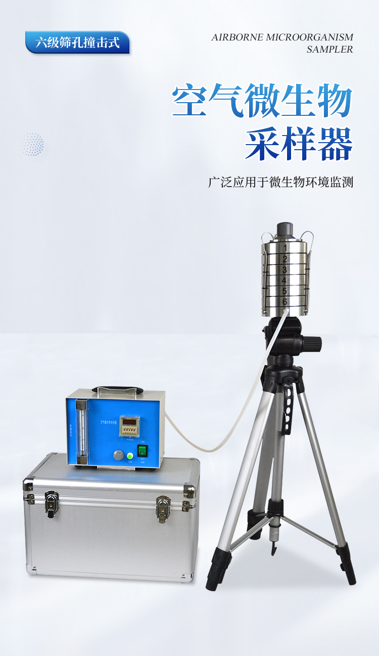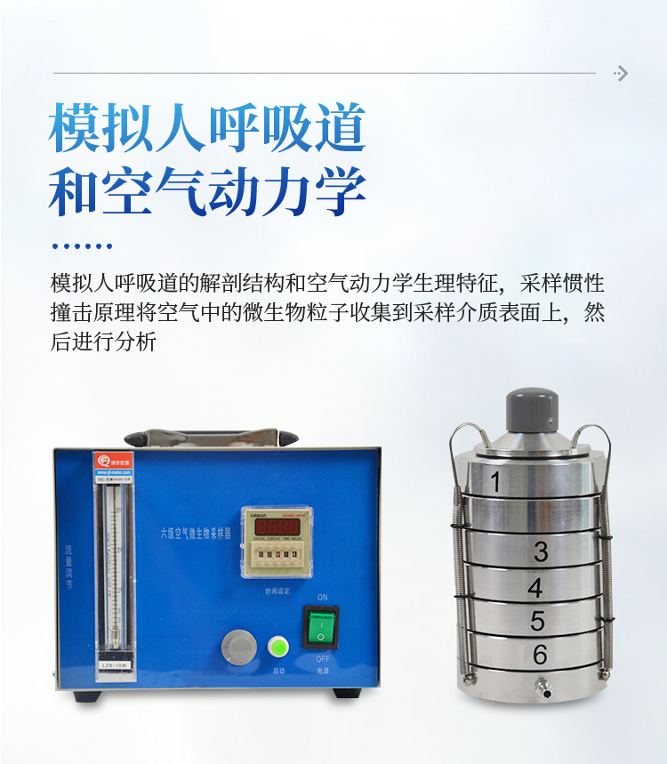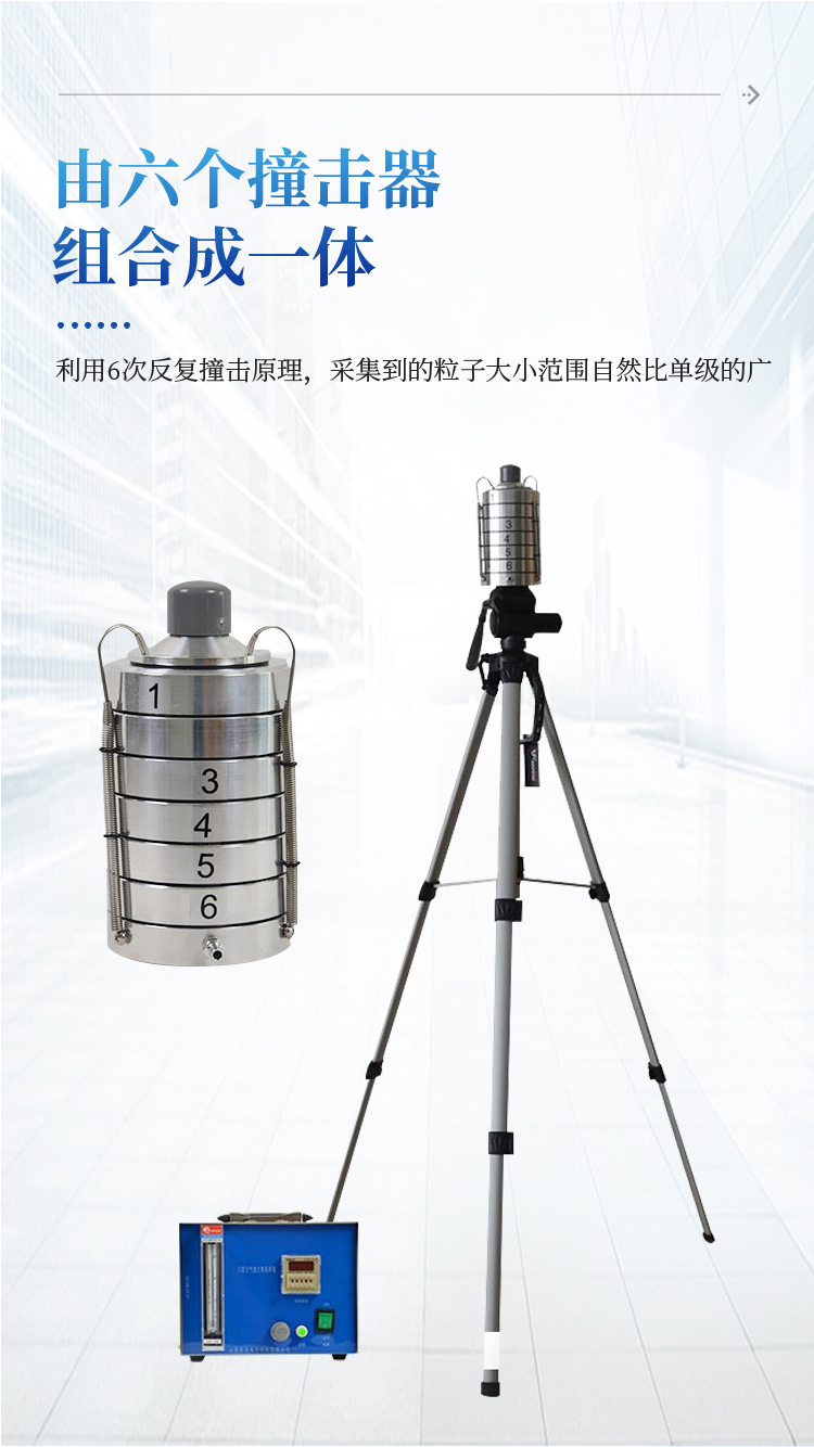 整个仪器是由撞击器、主机(流量计)、定时器、三脚架组成。撞击器是6层有微小孔眼的铝合金圆盘。圆盘下放琼脂平皿,每圆盘间有密封胶圈,在通过三个弹簧挂 钩把圆盘牢固地联在一起。每个圆盘上有400个成环行排列、逐层减小、尺寸精确的小孔,标准采样流量为1立方呎(28.3L/min)。当含有微生物粒子 的气流进入最上层的采样口后,由于气流的逐层增高,不同大小的微生物粒子按空气动力学特征分别撞击在相应的琼脂表面上。捕获在各级上的粒子大小范围是由该 级孔眼的气流速度和上一级的粒子截阻率而决定的。第1、2级类似人的上呼吸道捕获的粒子,第3~6级类似人的下呼吸道捕获的粒子,这就相当程度上复制了这 些粒子在呼吸道的穿透作用和沉着部位。