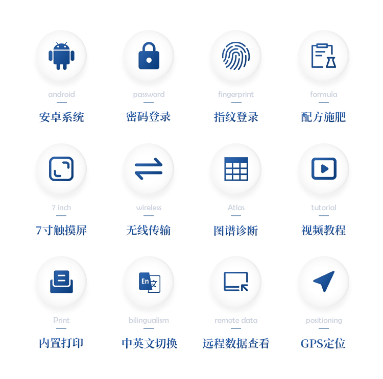 7.数据打印:内置热敏打印机(无需更换色带),可打印出检测项目、检测单位、检测人员、检测时间、通道号、吸光度、养分含量、以及二维码等信息。