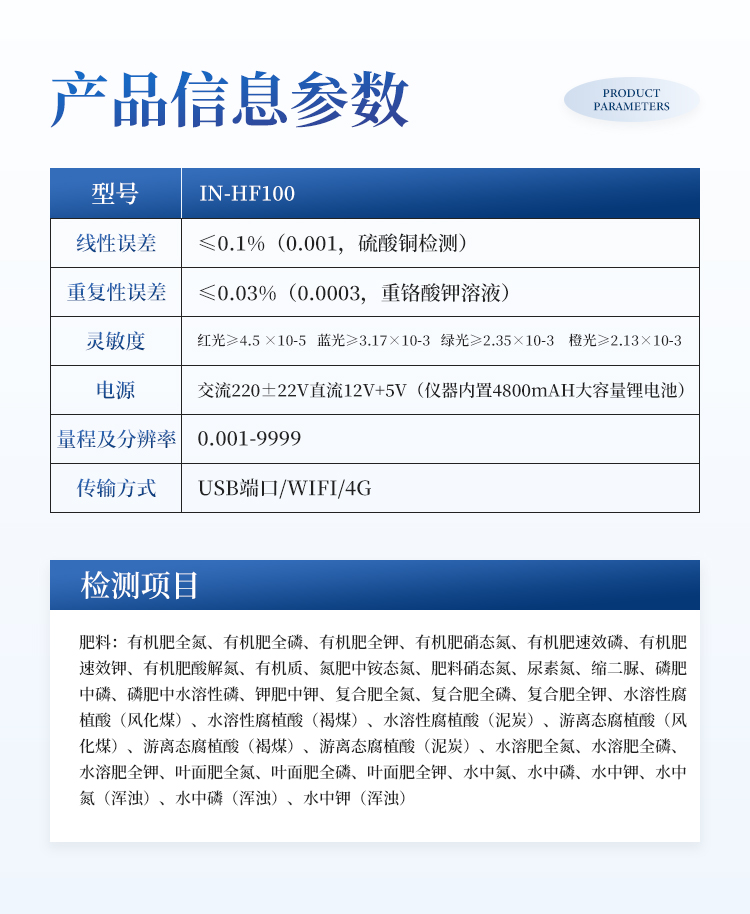 肥料:有机肥全氮、有机肥全磷、有机肥全钾、有机肥硝态氮、有机肥速效磷、有机肥速效钾、有机肥酸解氮、有机质、氮肥中铵态氮、肥料硝态氮、尿素氮、缩二脲、磷肥中磷、磷肥中水溶性磷、钾肥中钾、复合肥全氮、复合肥全磷、复合肥全钾、水溶性腐植酸(风化煤)、水溶性腐植酸(褐煤)、水溶性腐植酸(泥炭)、游离态腐植酸(风化煤)、游离态腐植酸(褐煤)、游离态腐植酸(泥炭)、水溶肥全氮、水溶肥全磷、水溶肥全钾、叶面肥全氮、叶面肥全磷、叶面肥全钾、水中氮、水中磷、水中钾、水中氮(浑浊)、水中磷(浑浊)、水中钾(浑浊)