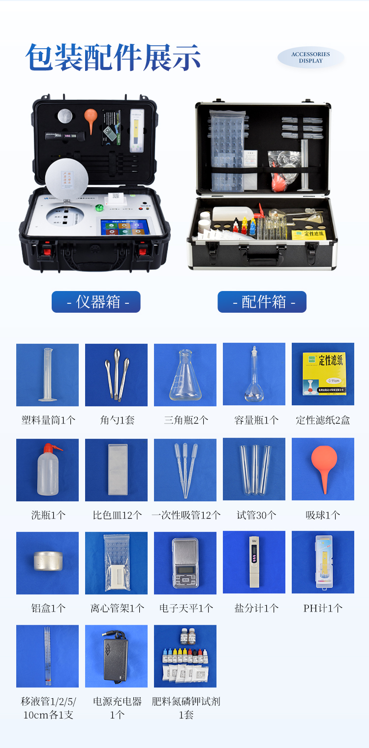1 | 主仪器(内置打印机) | 1台 | 1 | 肥料养分试剂 (氮、磷、钾、有机质) | 1套 |