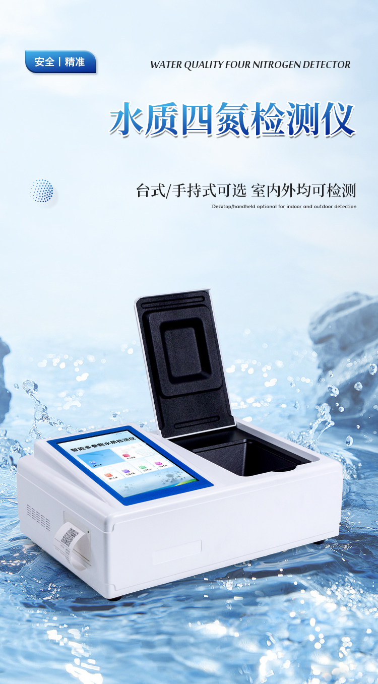 水质四氮检测仪是参考相关标准研发设计制造,本仪器主要检测水质氨氮、硝酸盐氮、亚硝酸盐氮、总氮浓度指标,兼具智能数据分析功能,图表、列表显示数据,分析一目了然;高清晰度彩色液晶触摸显示屏,Android智能操作系统,中文显示界面,中英文键盘,人性化操作,使用更简单。