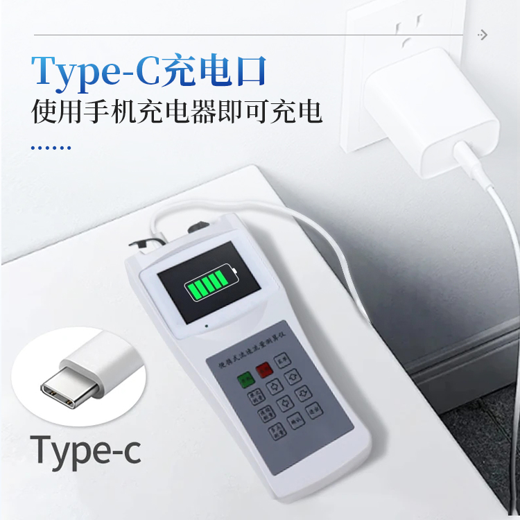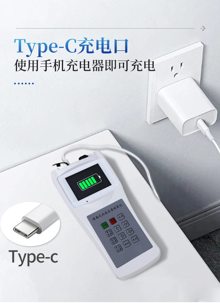 ①流速传感器、②信号连接器、③流速测算仪、④充电头、⑤数据线