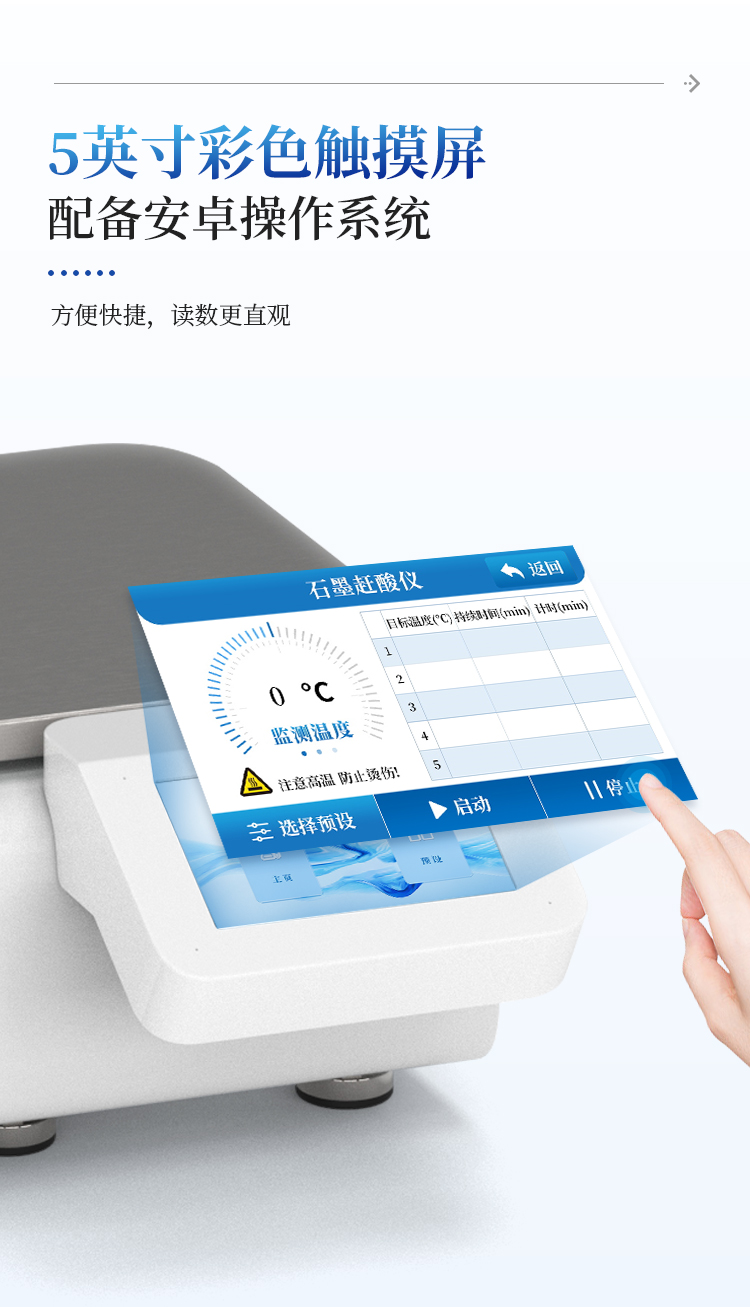1. 使用5英寸彩色触摸屏进行仪器操作,配备安卓操作系统,方便快捷。