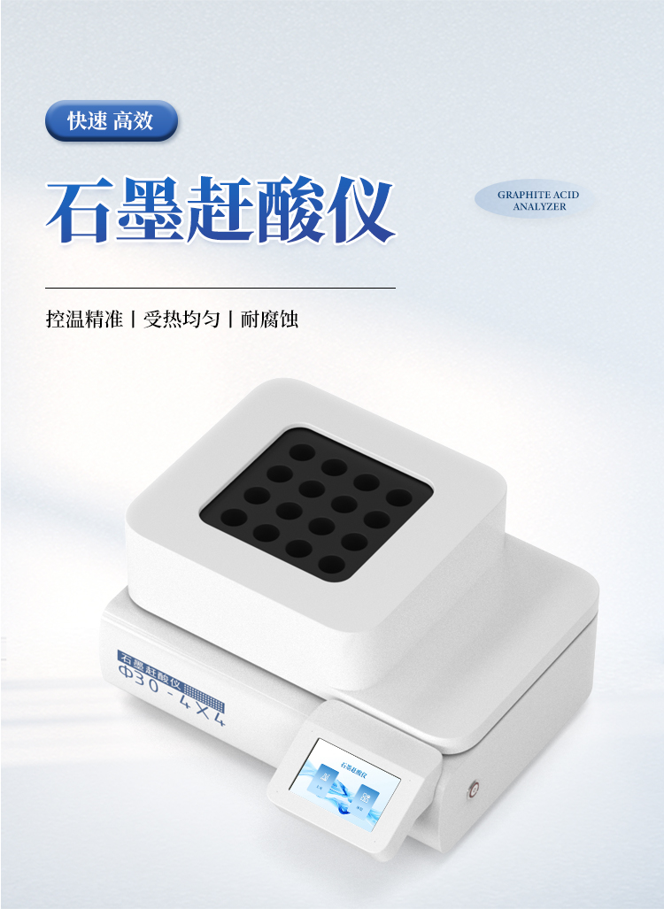 简要描述: 石墨消解设备采用优质高纯石墨材质,结合精确的环绕立体加热技术,确保消解孔间温差极小,有效保障了批量样品处理的平行性与结果准确性。智能PID温控系统支持高精度程序升温,用户可灵活设定并存储多组消解程序,操作简便,重现性极佳。同时,仪器具备超温保护、漏电保护等多重安全机制,配合耐腐蚀设计及友好的操作界面,在提升实验效率的同时,全力守护实验安全。