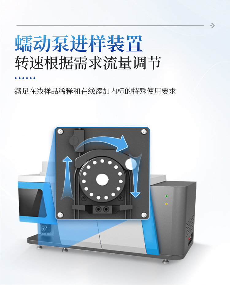 1.4 蠕动泵为 5 通道 16 滚轴全自动设计,蠕动泵转速连续可调。确保稳定进样的同时,可 支持进样、排废、在线内标和其他试剂进样管(氢化物发生器)同时运行。