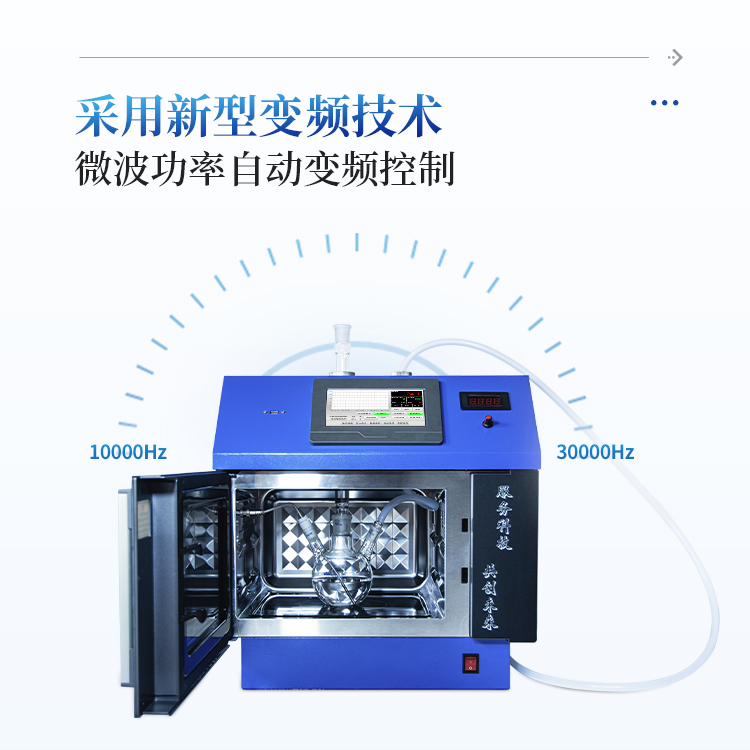 采用醉新变频技术,通过变频器将50Hz工频转换为10000——30000Hz可变频率,取代了传统微波反应器使用的高压变压器,完美解决了传统微波反应器精确控温时,高压变压器受尖峰脉冲的冲击,造成变压器频繁损坏的技术缺陷。MCU根据Pt100传感器实时检测到的温度变化数据、反应物质极性、热容变化、反应时间等数学模型的变化条件,自适应PID调节,自动变频控制微波输出功率,从而精确控温。