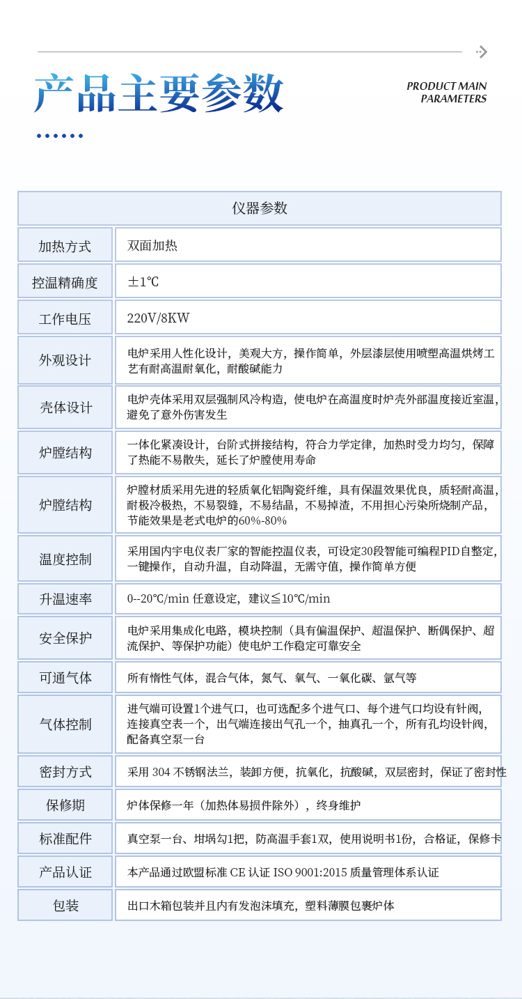 简要描述: 管式气氛炉炉膛结构一体化紧凑设计,台阶式拼接结构,符合力学定律,加热时受力均 匀,保障了热能不易散失,延长了炉膛使用寿命;炉膛材质采用先进的轻质氧化铝陶瓷纤维,具有保温效果优良,质轻耐高温,耐极冷极热,不易裂缝,不易结晶,不易掉渣,不用担 心污染所烧制产品。节能效果是老式电炉的 60%-80%。