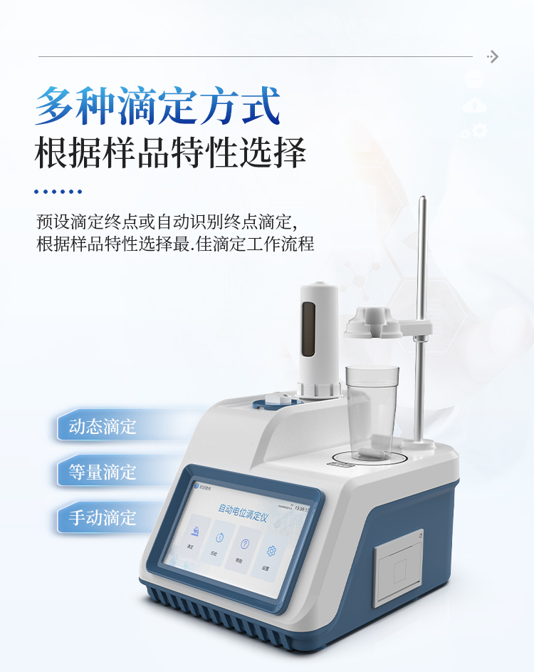 简要描述: 全自动电位滴定仪用户可选配电导滴定、永停滴定等扩展模块,满足用户多功能需求;设备对国家标准中采用的电位滴定法均满足,用户可根据检测需求选择适配的电极即可;支持动态滴定、等量滴定、手动滴定的滴定方式,可预设滴定终点或自动识别终点滴定,方便用户根据样品特性选择最佳滴定工作流程。
