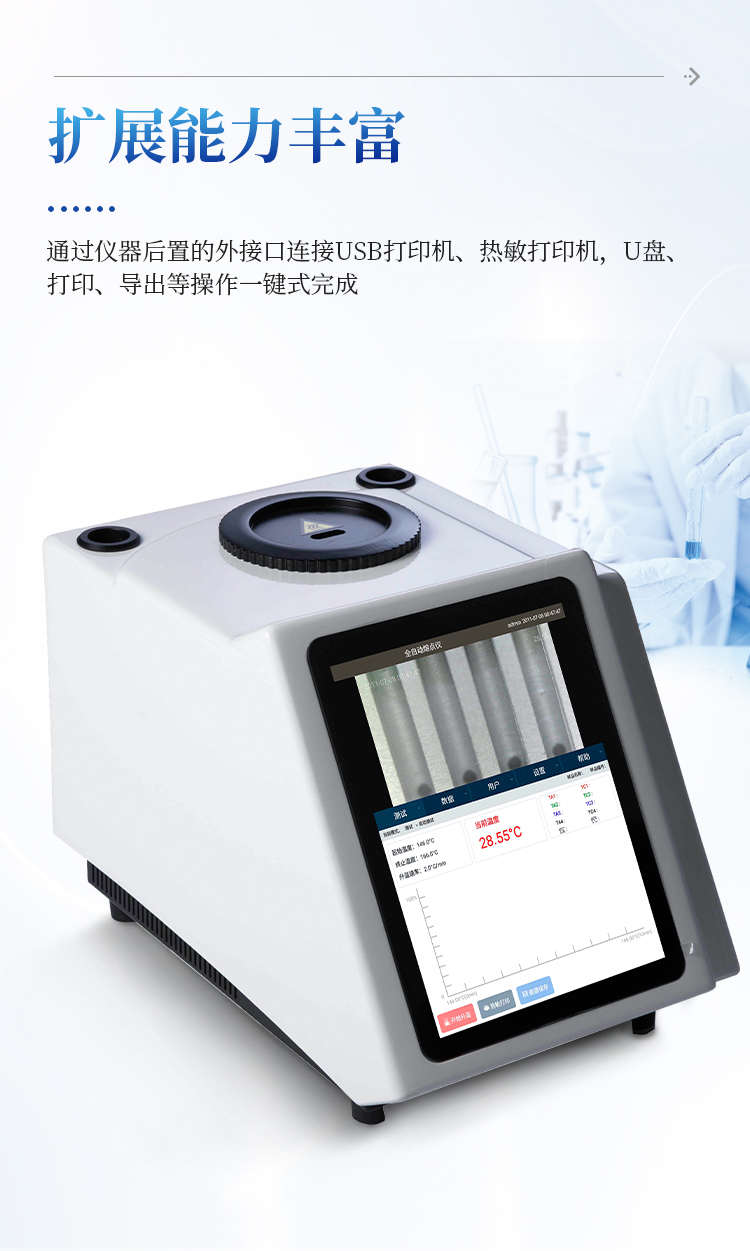 简要描述: 全自动熔点仪完美结合高精度控温技术和高清视频摄像技术,不但为用户提供准确、稳定、可靠的测试结果,还为用户带来高效便捷的测试感受。高清视频可方便清晰的看到样品熔化的全过程,自动检测实时图谱显示,方便用户准确测得样品熔点和熔距。