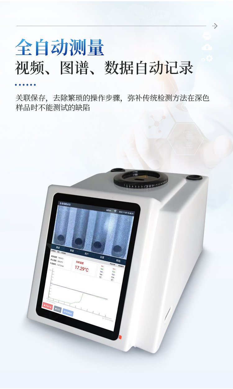 全自动熔点仪完美结合高精度控温技术和高清视频摄像技术,不但为用户提供准确、稳定、可靠的测试结果,还为用户带来高效便捷的测试感受。高清视频可方便清晰的看到样品熔化的全过程,自动检测实时图谱显示,方便用户准确测得样品熔点和熔距。