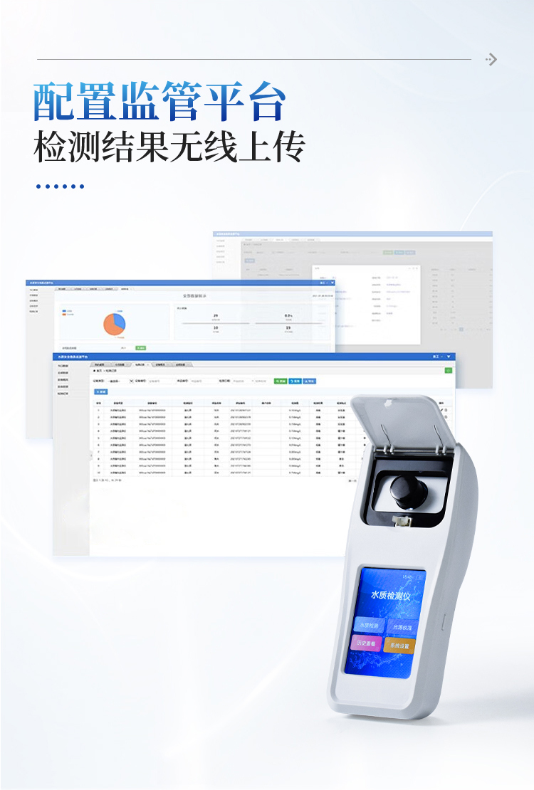 简要描述: 亚氯酸盐检测仪安卓智能系统,操作更佳简便快捷;配置云监控平台,检测结果可直接无线传至平台,进行水质长短期分析,辅助管理。内置操作流程、操作简单、无需培训、直接上手;检测速度更快,现场读取数据;便携式体积小,重量轻,方便户外检测。