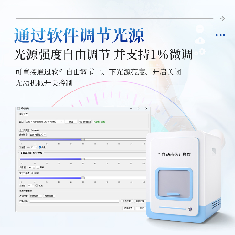 该系列全自动菌落计数仪配备了灵活的上、下双光源系统,用户可以根据不同培养皿的类型、菌落特性以及背景情况,用软件自由调节光源以获得最佳的成像效果。