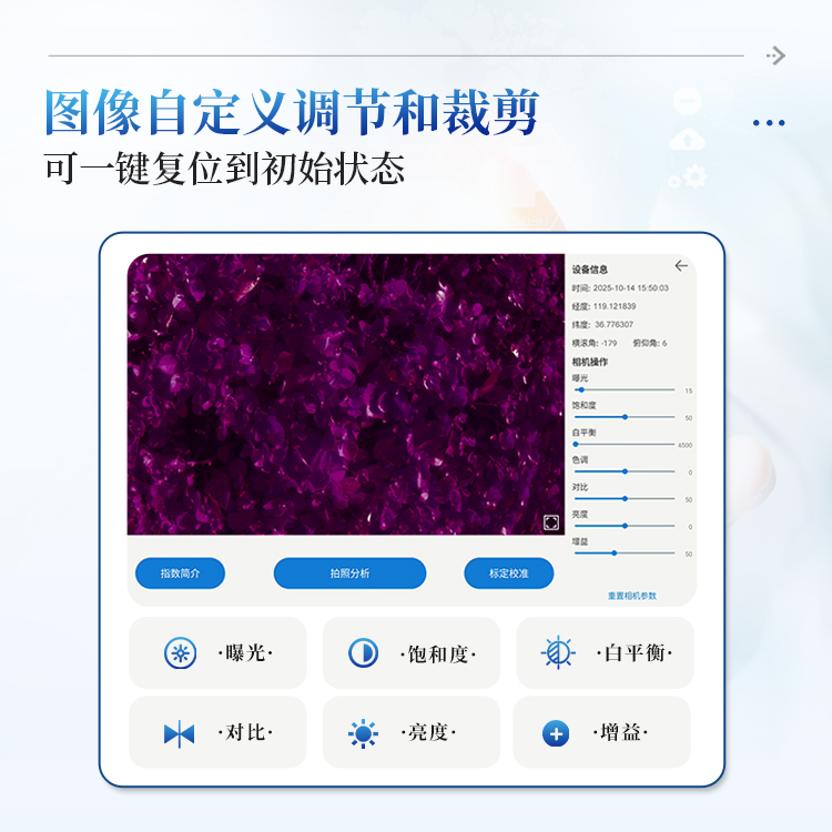 5. 图像调节: 支持曝光,饱和度、白平衡、色调、对比、亮度、增益等调节,支持图像自定义裁剪。可一键复位