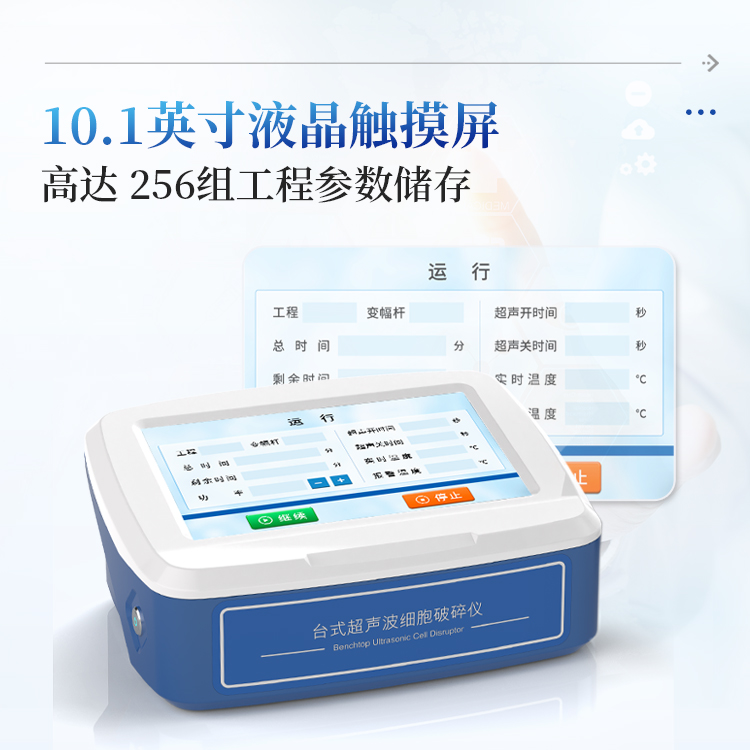 自研自产的超声波细胞破碎仪。功能齐全、外观新颖、性能可靠。仪器采用大屏液晶显示;中央微机集中控制,超声输出、间隙时间、超声功率,样品温度监测显示,频率自动跟踪,故障自动报警等功能。适用于生物化学、微生物学、药物化学、表面化学、物理学、动物学、农学、医学、制药等领域的教学、科研及生产。
