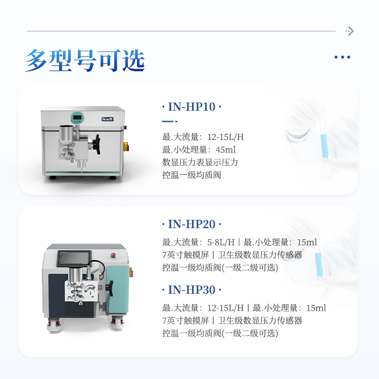 简要描述: 实验型高压均质机IN-HP20物料控温:要求均质阀带控温夹套与控温介质出入接头、连接管路,可实现在线控温,出料温度控制在 -5℃~100 ℃ (根据物料要求不同而定);实现高压均质部件恒温控制,实现设备与物料同时控温。保证物料生物学活性。压力显示:选用≥7寸触摸屏和卫生级数显压力传感器显示压力曲线,精度更高、更灵敏,不易损坏。