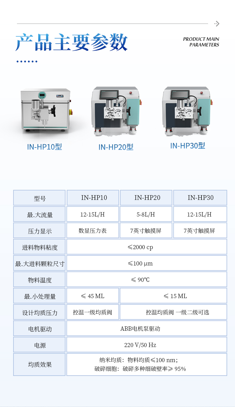 简要描述: 实验室纳米均质仪进料物料粘度:≤2000 cp,最大进料颗粒尺寸 ≤100 μm,物料温度 ≤ 90℃。进料模式:Tri-Clamp快速连接带自吸料设计,无须额外加泵吸料,避免污染及料斗搭配。高压密封采用进口材料,疲劳强度高,耐磨损。使密封长期高压运行保持状态良好。动力源要求:ABB电机泵驱动,电源:220 V/50 Hz。