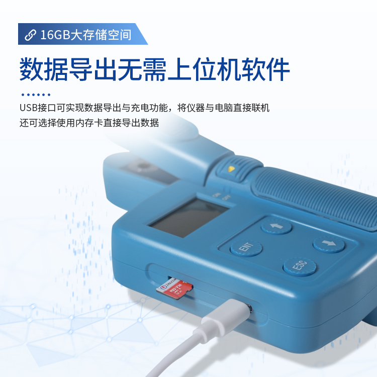 5.多功能USB接口,可实现数据导出与充电功能,可将仪器与电脑直接联机,数据导出无需上位机软件,还可选择使用内存卡直接导出数据,操作简单方便