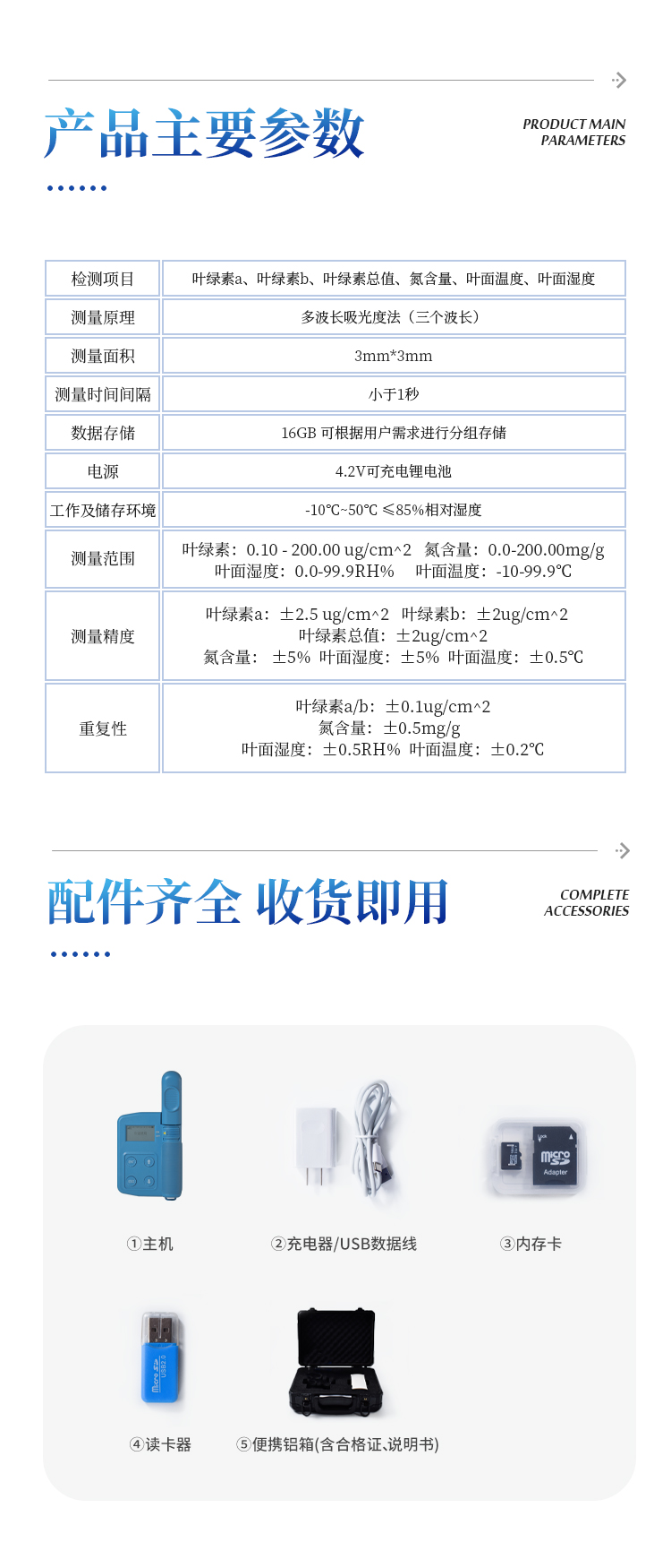 3. 测量范围:叶绿素:0.10 - 200.00 ug/cm^2 氮含量:0.0-200.00mg/g 叶面湿度:0.0-99.9RH% 叶面温度:-10-99.9°C