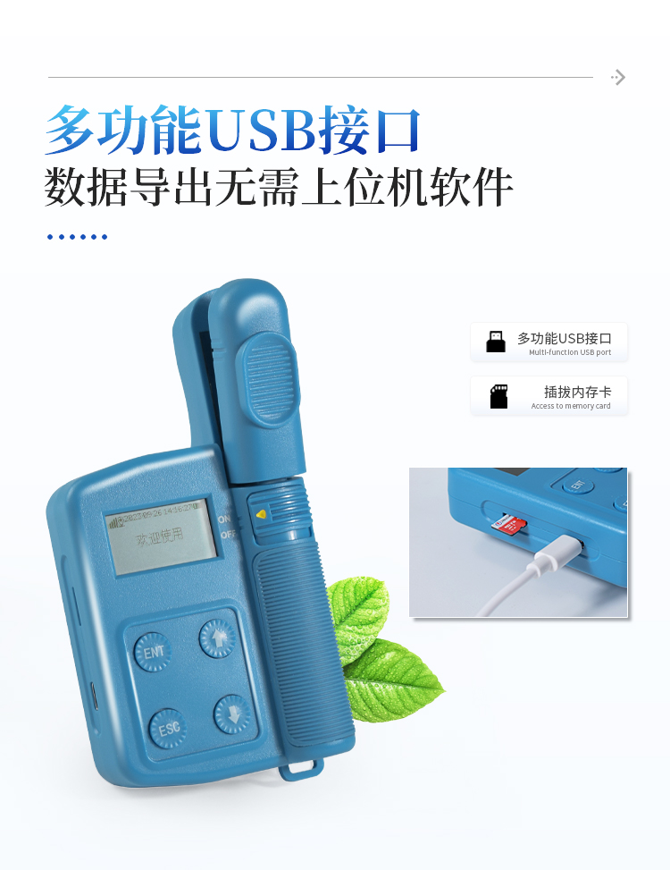 1.快速无损植物活体检测,测量时只需将叶片插入即可,不需要采摘叶片,不影响作物正常生长,可以在作物生长过程中全程对叶片进行监测,从而得到更科学的分析结果