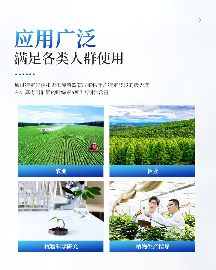 简要描述: 叶绿素a、b检测仪是一种通过特定光源和光电传感器获取植物叶片特定波段的吸光度,并计算得出准确的叶绿素a和叶绿素b含量的无损检测设备。它具备便携轻便的特点,可在野外对非离体的植物叶片进行定量检测,用于帮助判断植物生理生态的异常情况。这款仪器提供真实的叶绿素a和叶绿素b含量数值,而非SPAD值。