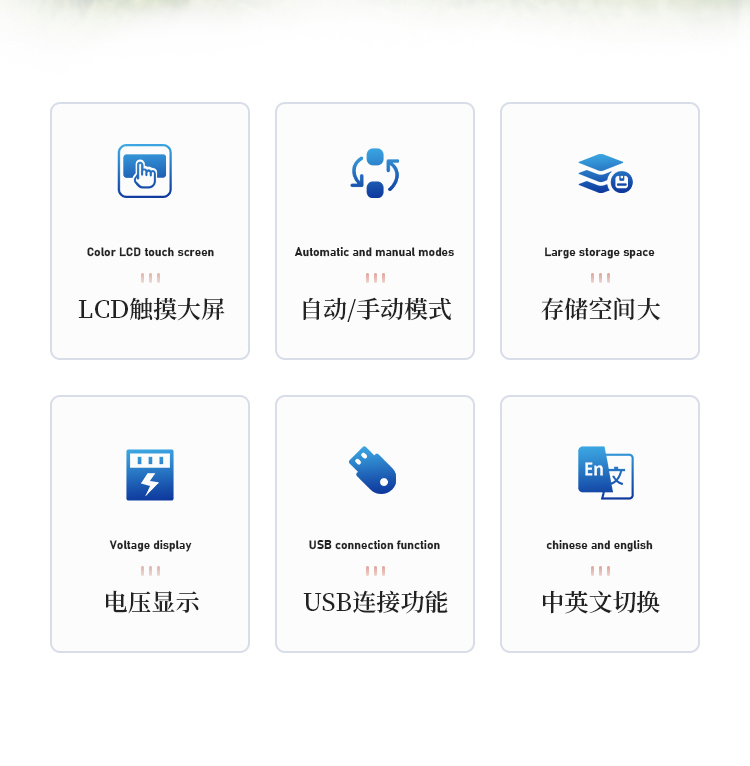 1. 配备4.3英寸彩色LCD触摸大屏,支持中英文菜单切换。