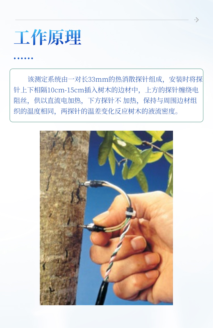 采用法国学者Granier在20世纪80年代后发明的一种测定Sap Flow的新方法,即热消散探针法(恒定热流传感器法)。该方法的数据采集具有准确稳定的特点,而且可以连续不间断的读取数据,因而数据具有系统性。该测 定系统由一对长33mm的热消散探针组成,安装时将探针上下相隔10cm-15cm插入树木的边材中,上方的探针缠绕电阻丝,供以直流电加热,下方探针不 加热,保持与周围边材组织的温度相同,两探针的温差变化反应树木的液流密度。