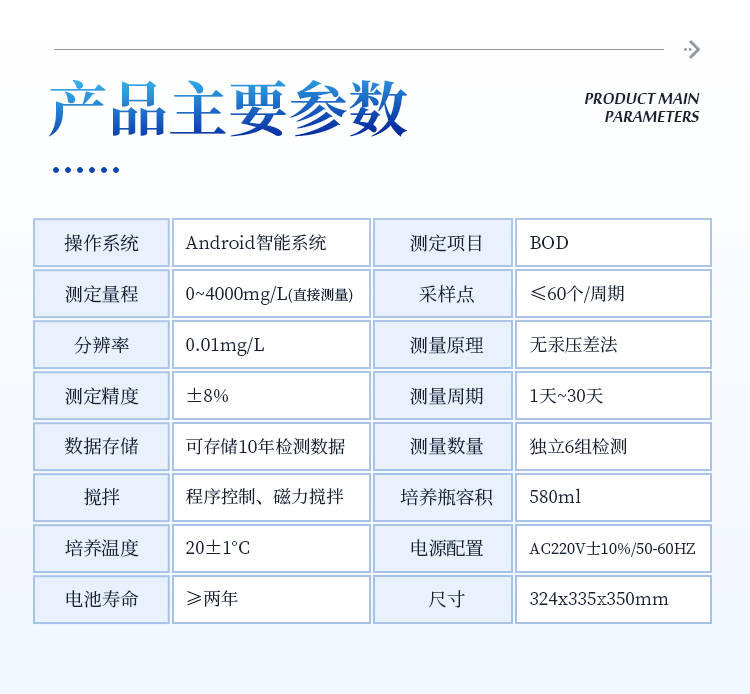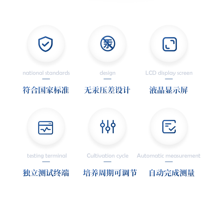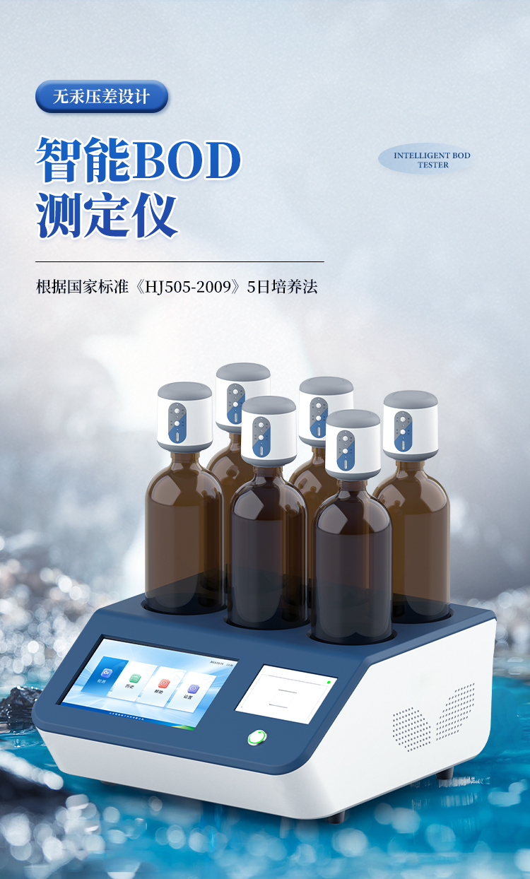 生化需氧量(BOD)测定仪是根据国家标准《HJ505-2009》5日培养法,模拟自然界中有机物的生物降解过程,采用简单、安全、可靠的无汞压差感测法测量水中BOD浓度;全智能化设计,领先的研发工艺和设计制造,实验过程无需实验人员值守;适用于排污企业、环境监测、污水处理厂、第三方检测机构、科研、高校等领域的生化需氧量测定。